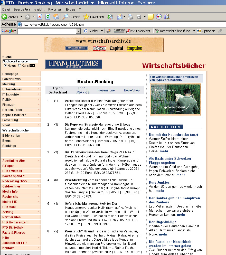 4: Bestsellerliste Wirtschaftsbücher Financial Times Deutschland